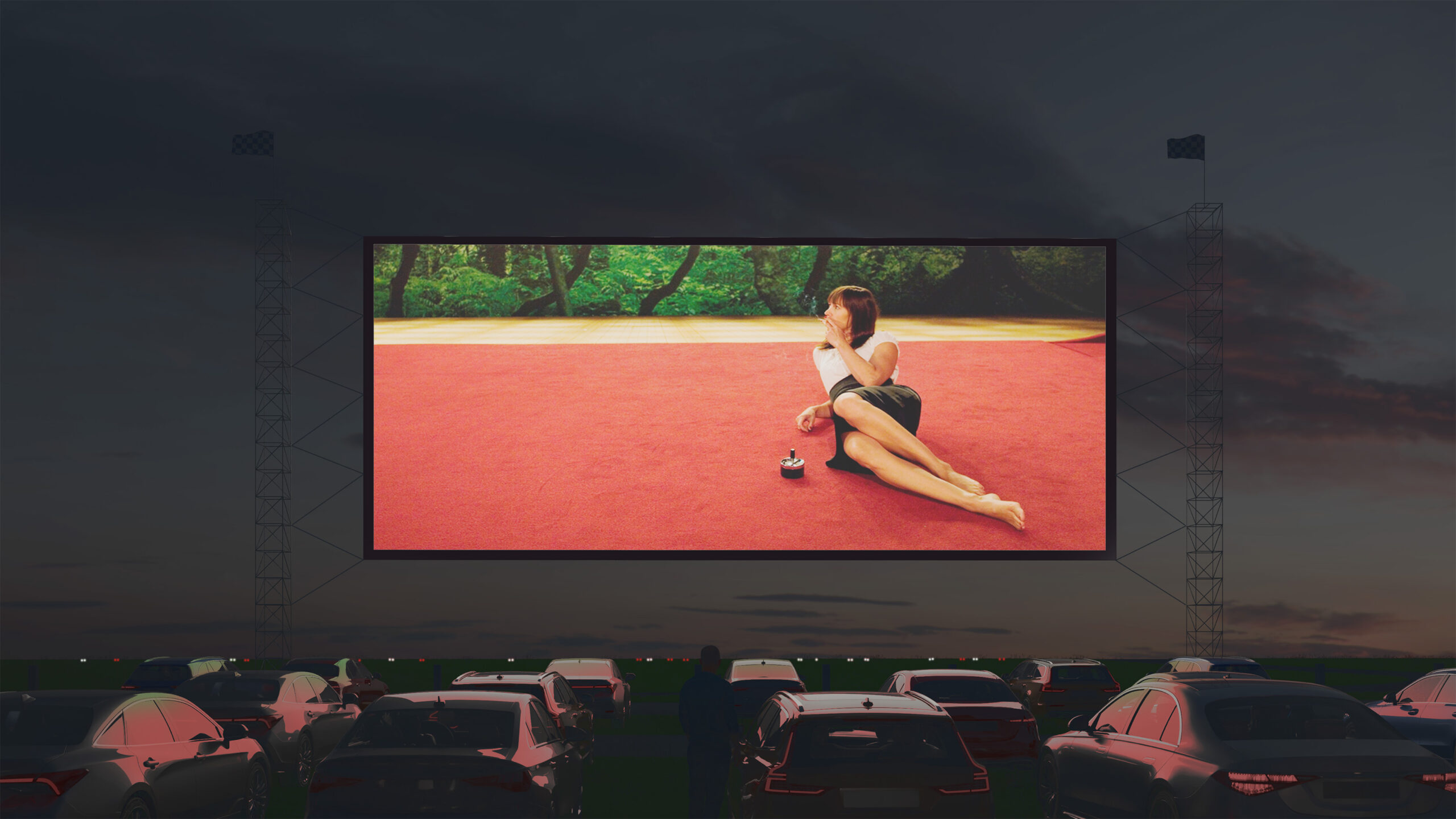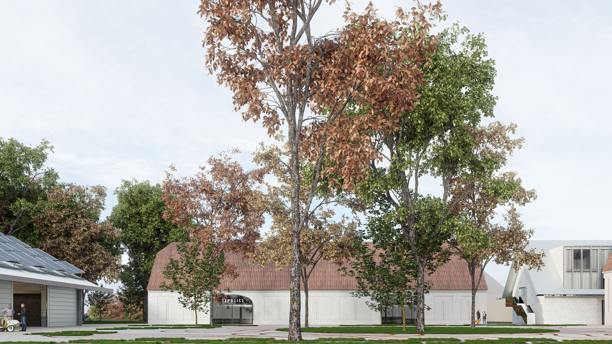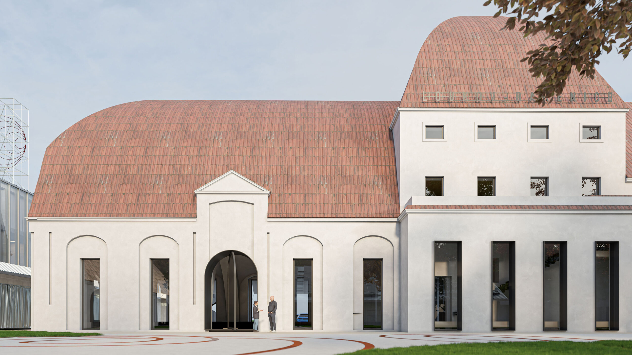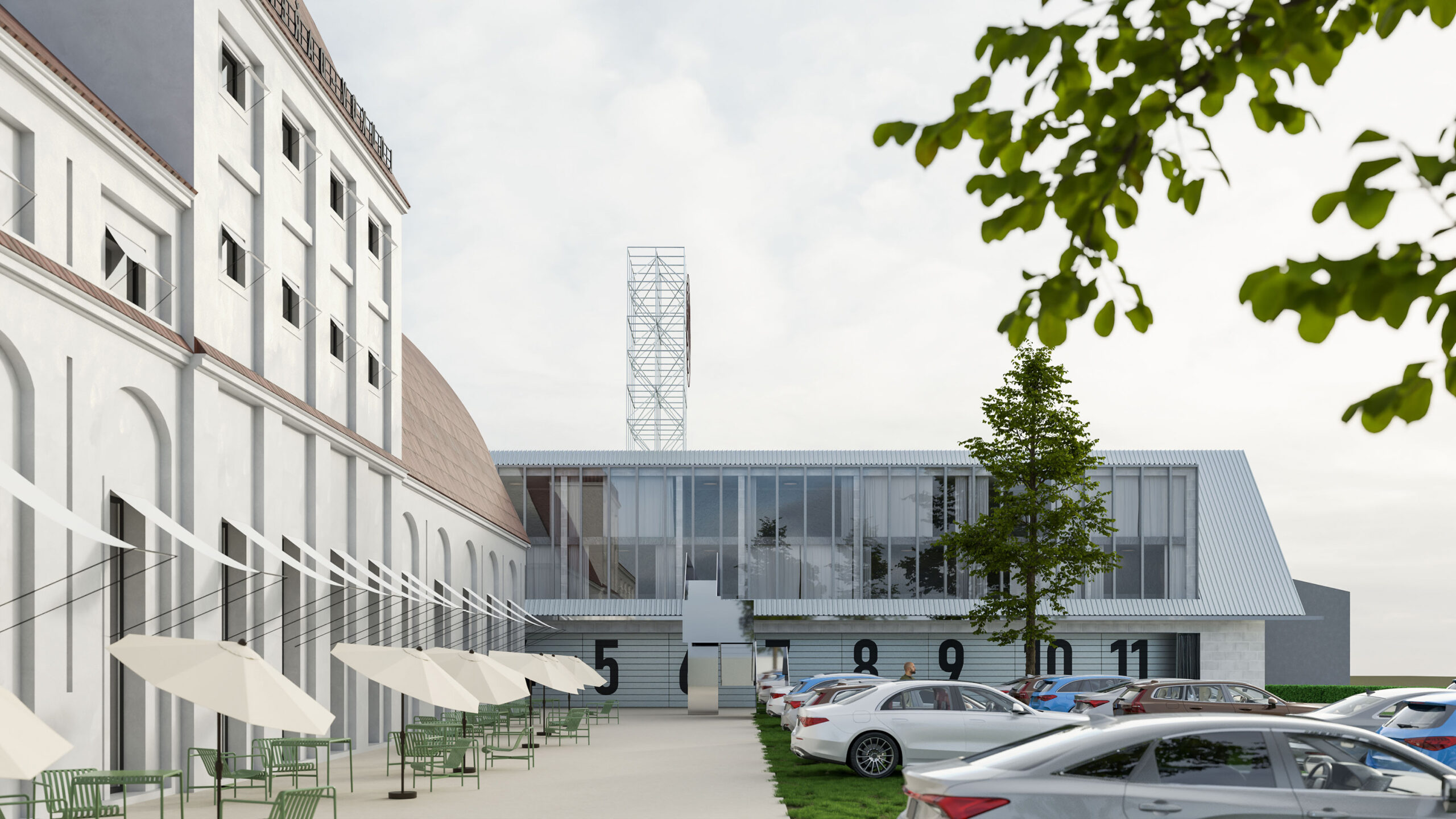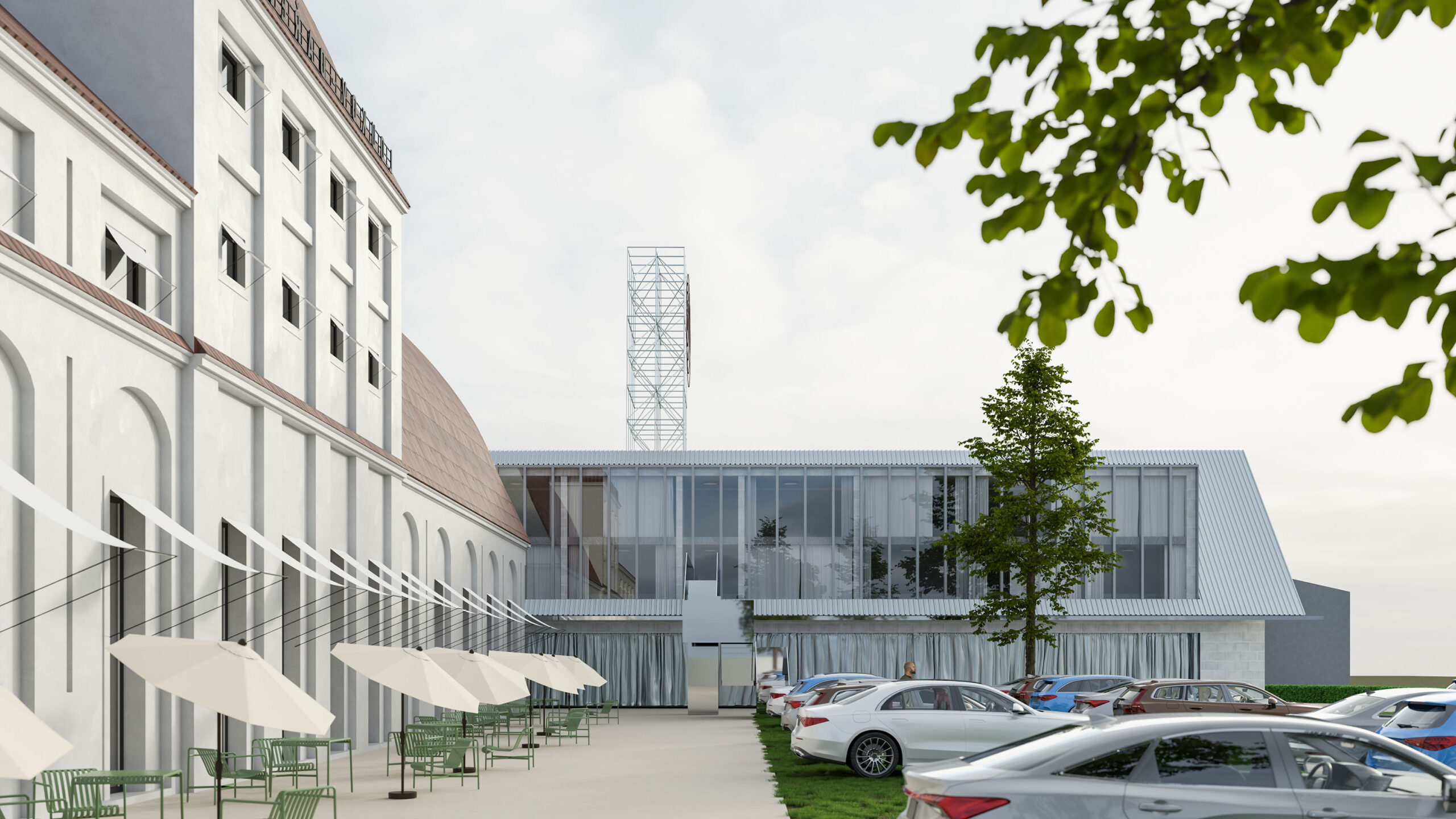 Můj pohled sklouzne k nové budově – Stáj. Na její střeše se tyčí kovový světlík, který se v noci září neonem a ukazuje cestu. Dnes se tu sešlo mnoho hostů: sleduji, jak se dvůr mění v letní kino. Mezi sloupy je napnuté plátno, lidé si přinášejí židle, někteří zůstávají v autech. Všechno utichá, světla pohasínají — a plátno ozáří první záběry filmu.