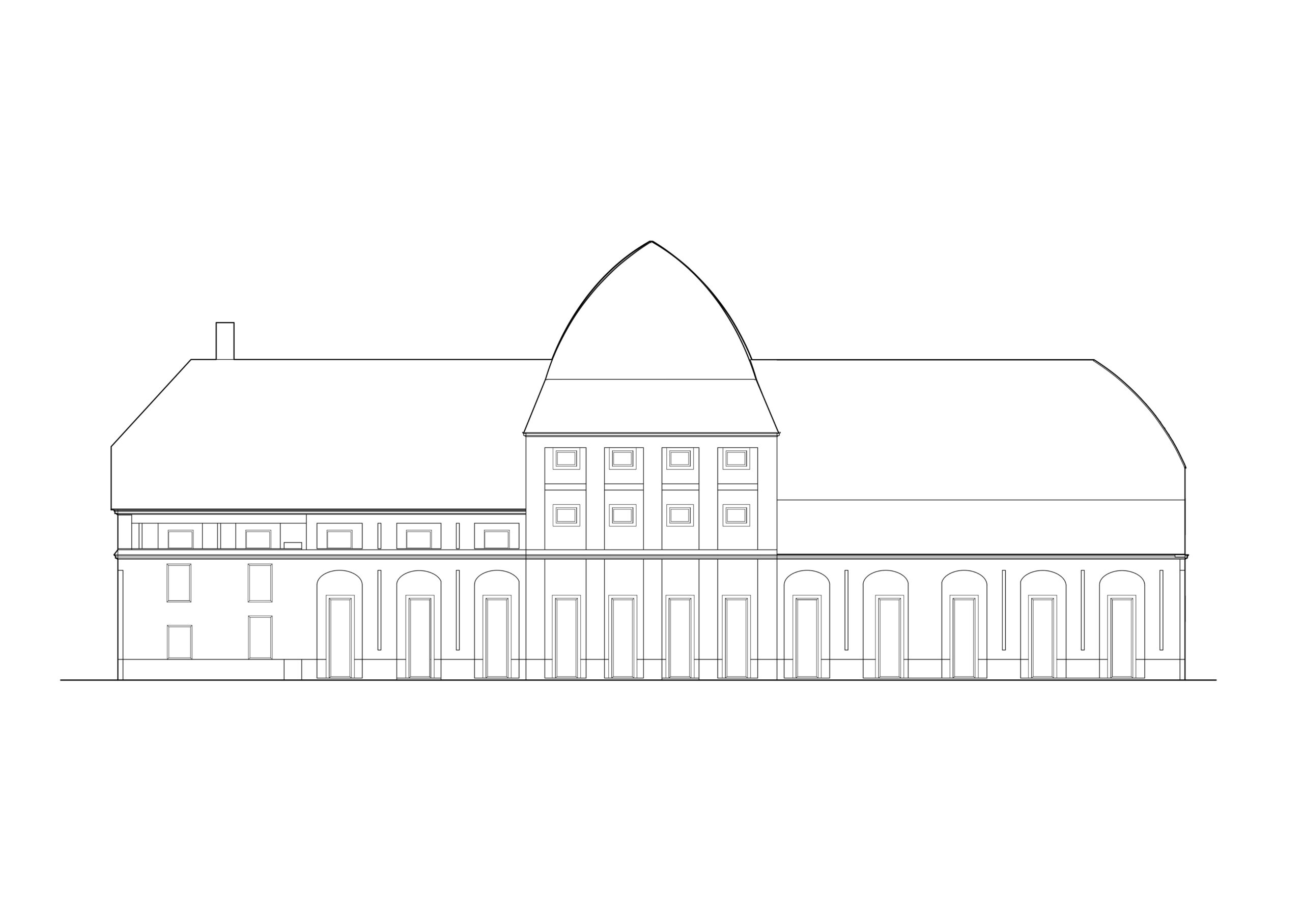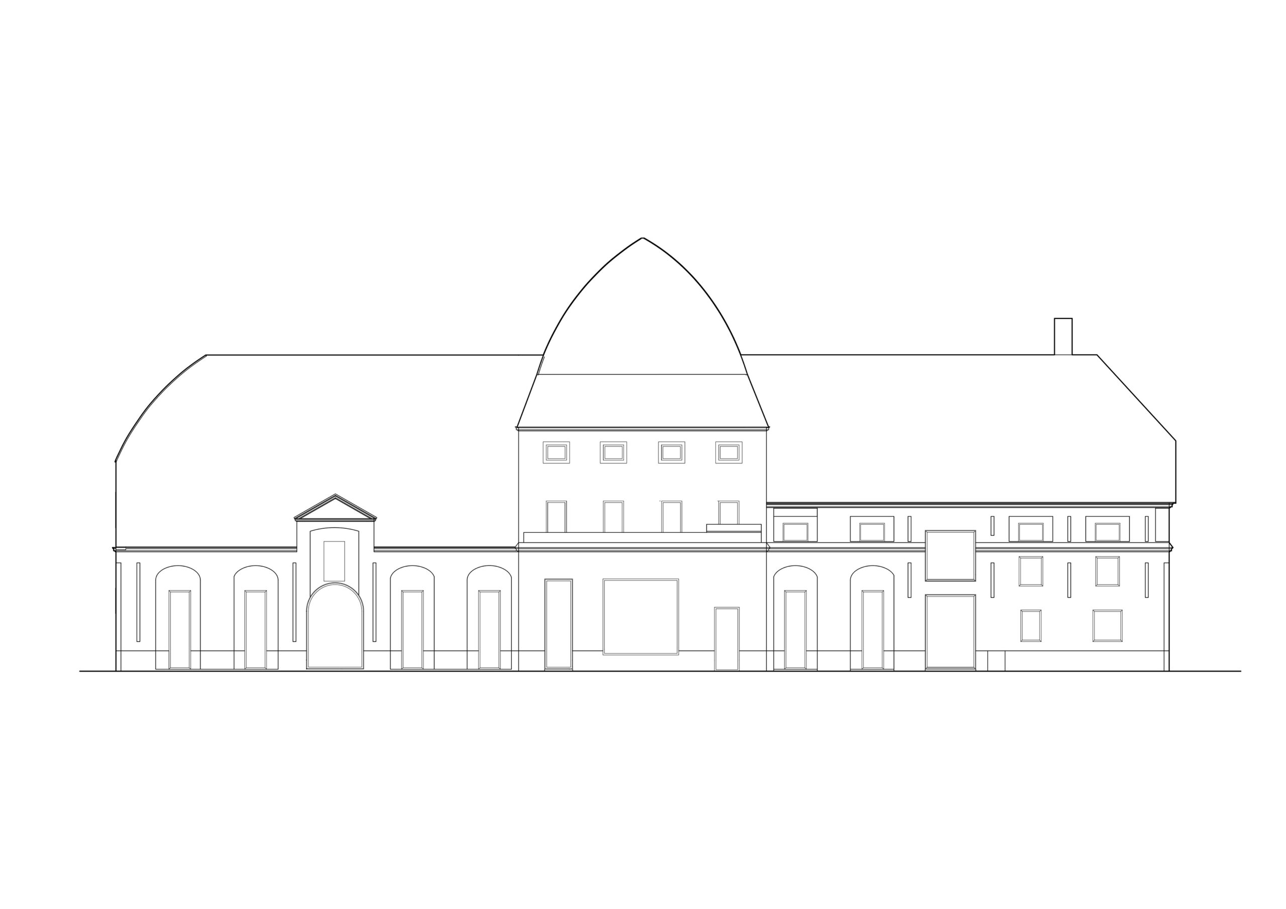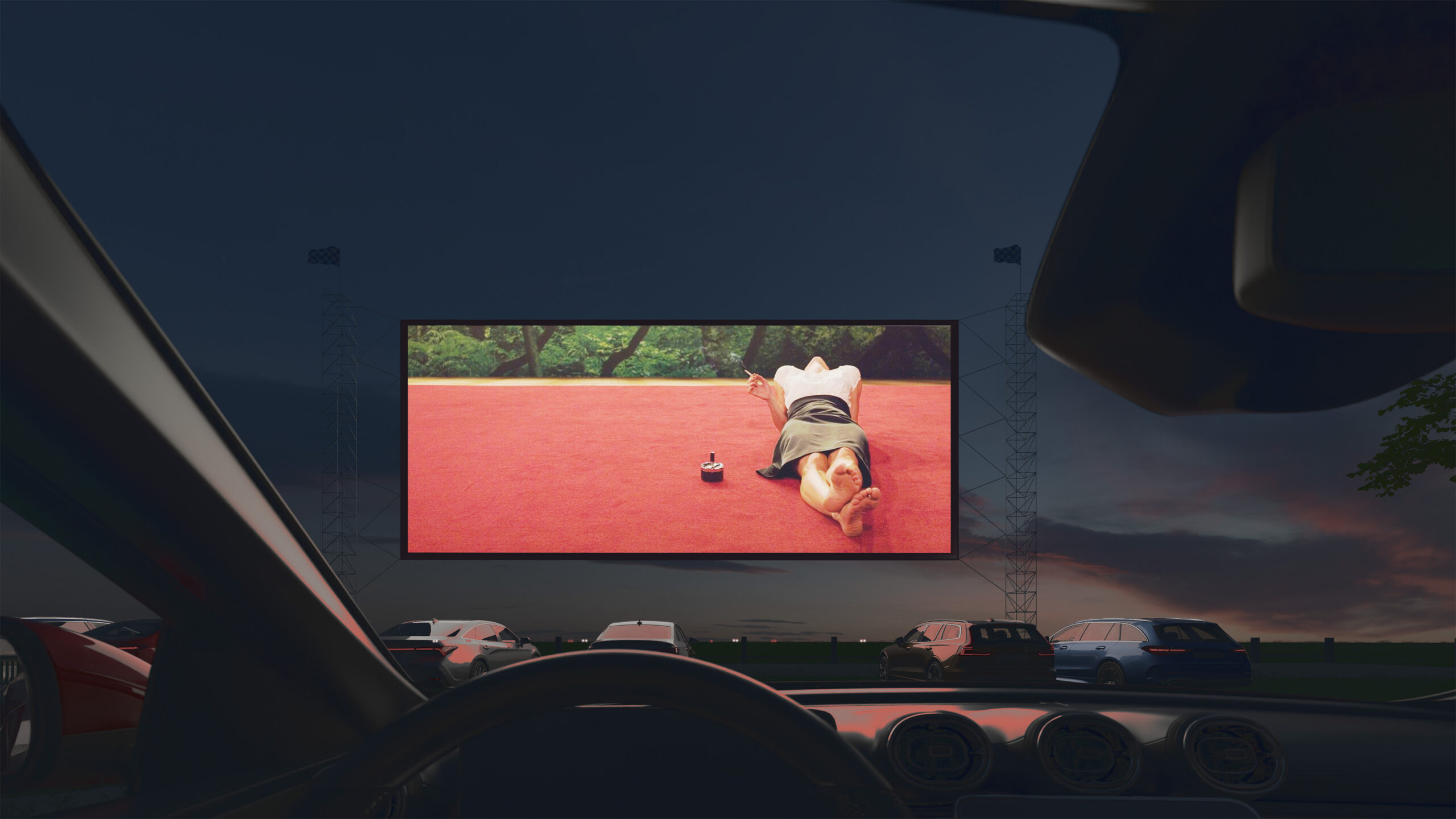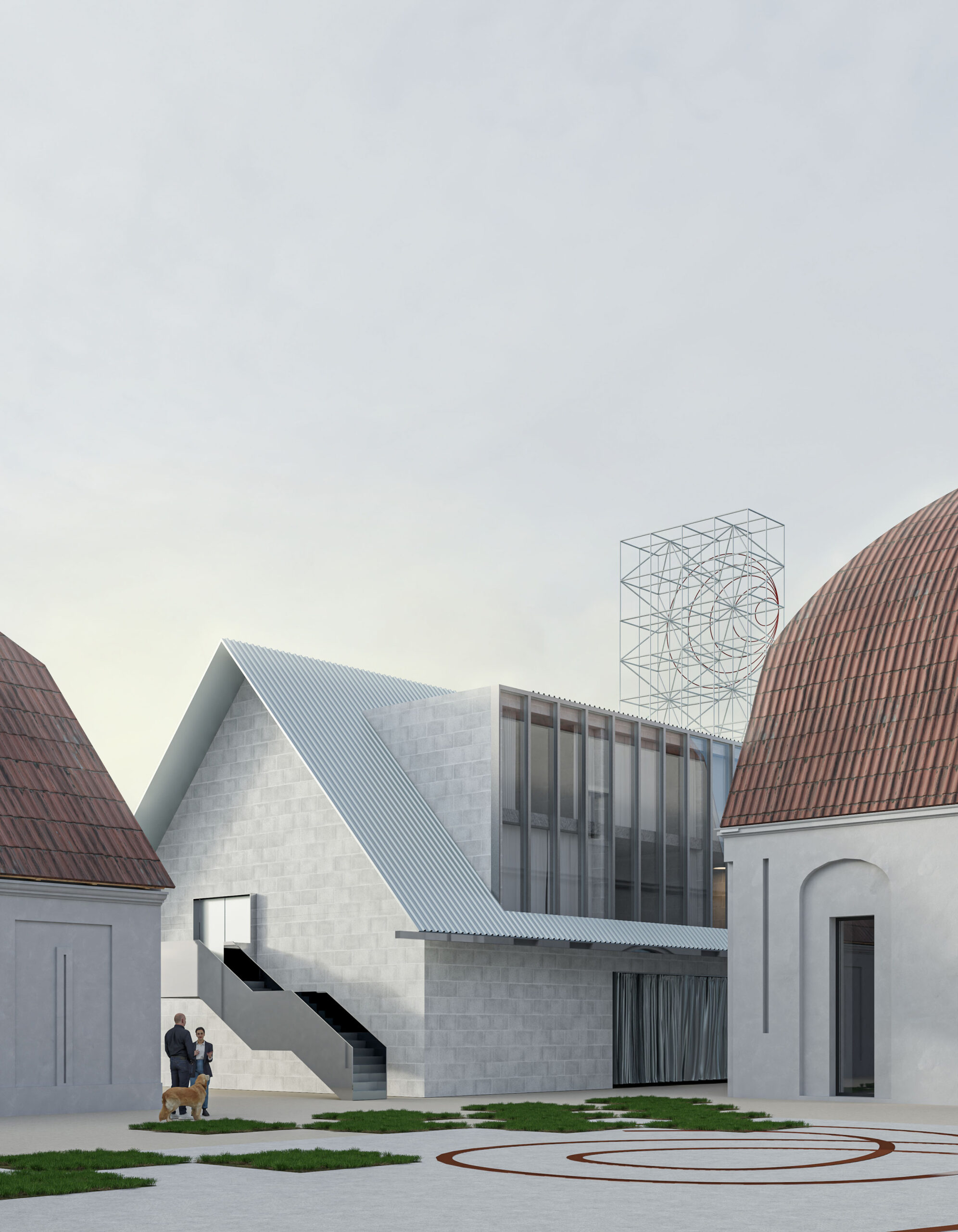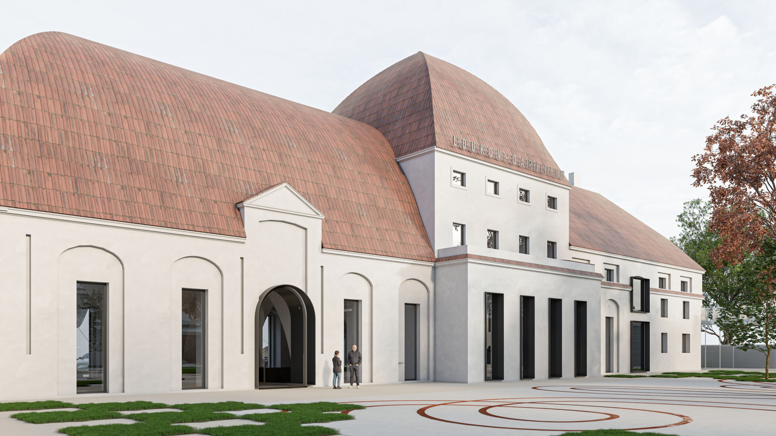 Můj pohled sklouzne k nové budově – Stáj. Na její střeše se tyčí kovový světlík, který se v noci září neonem a ukazuje cestu. Dnes se tu sešlo mnoho hostů: sleduji, jak se dvůr mění v letní kino. Mezi sloupy je napnuté plátno, lidé si přinášejí židle, někteří zůstávají v autech. Všechno utichá, světla pohasínají — a plátno ozáří první záběry filmu.