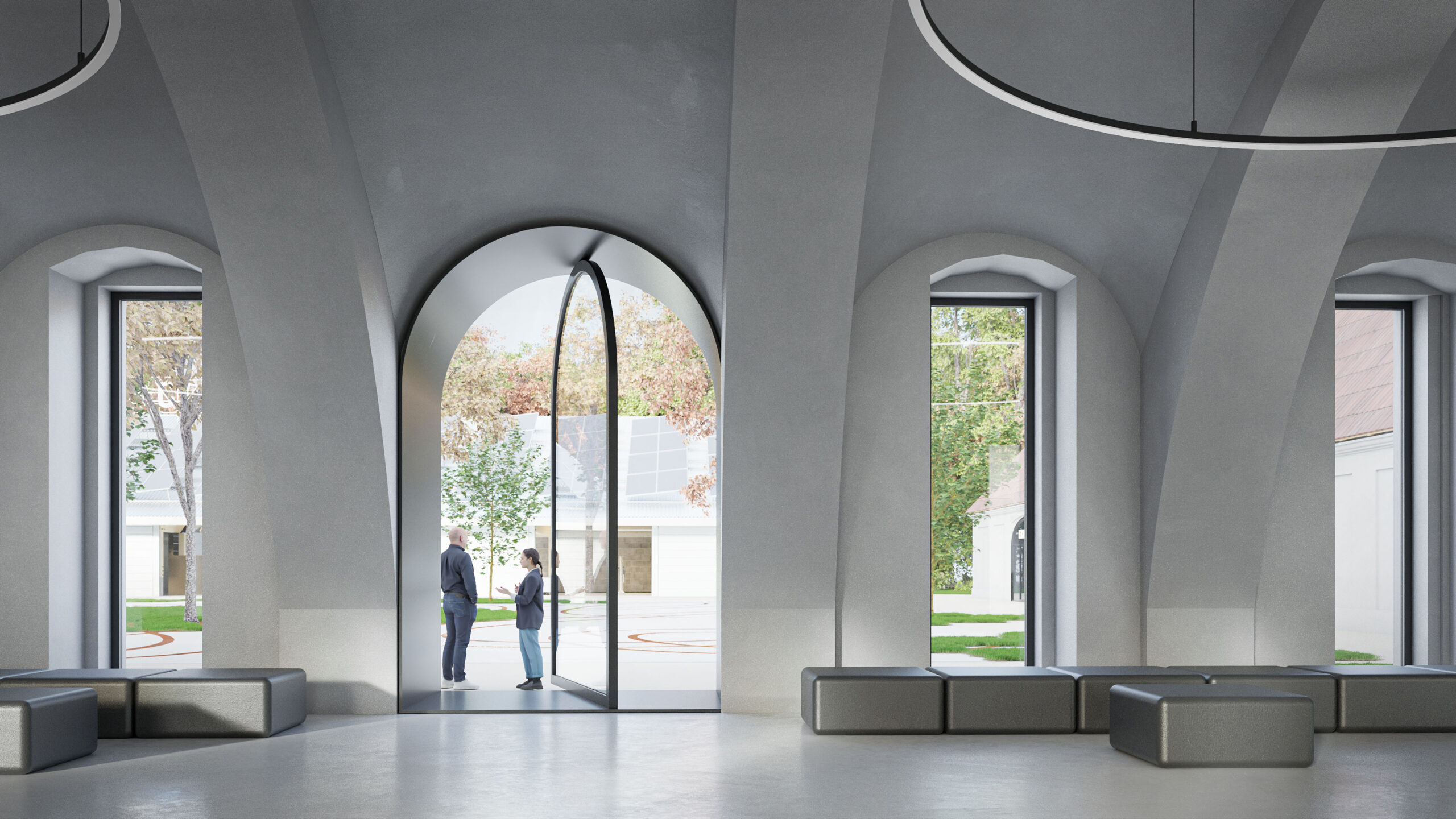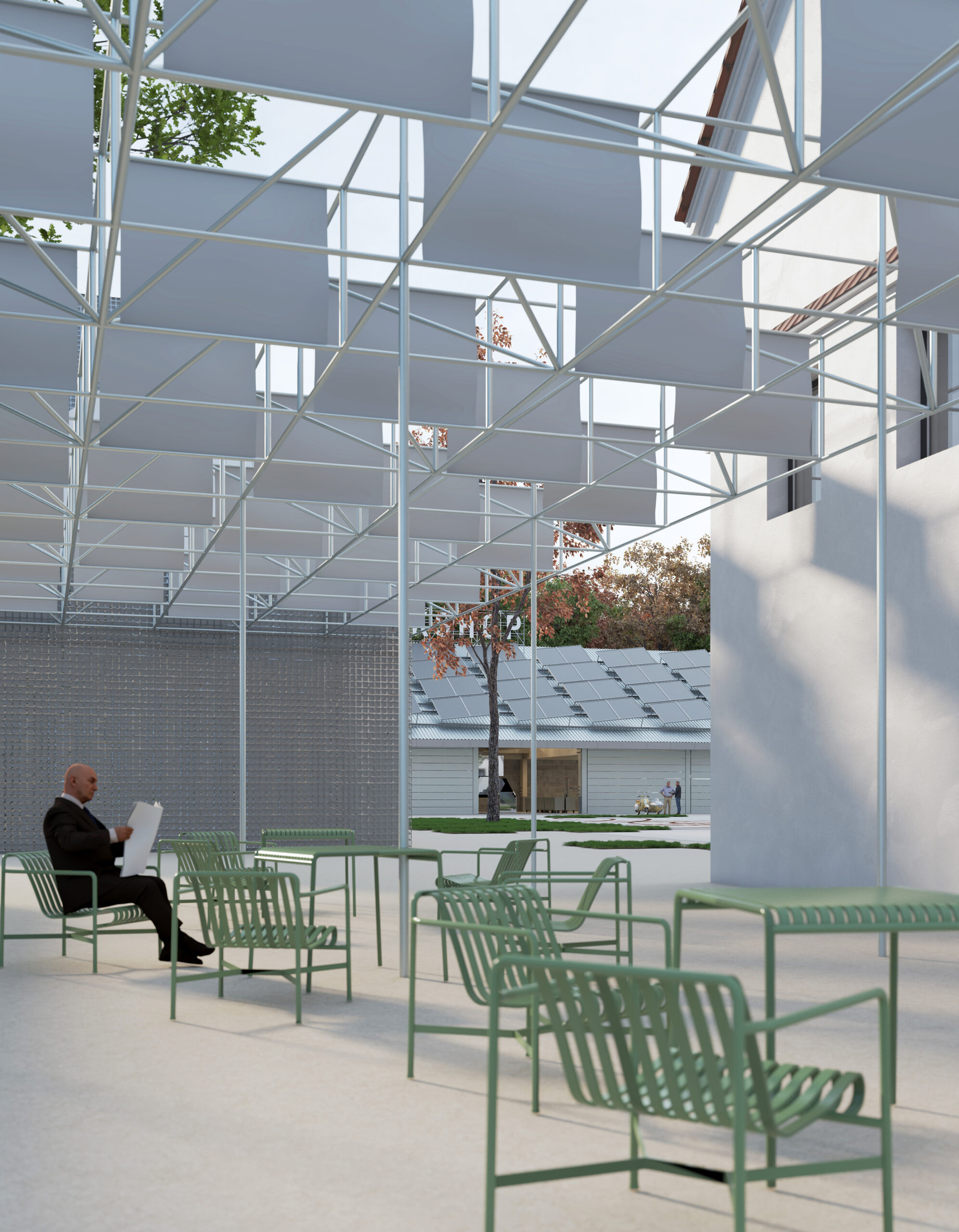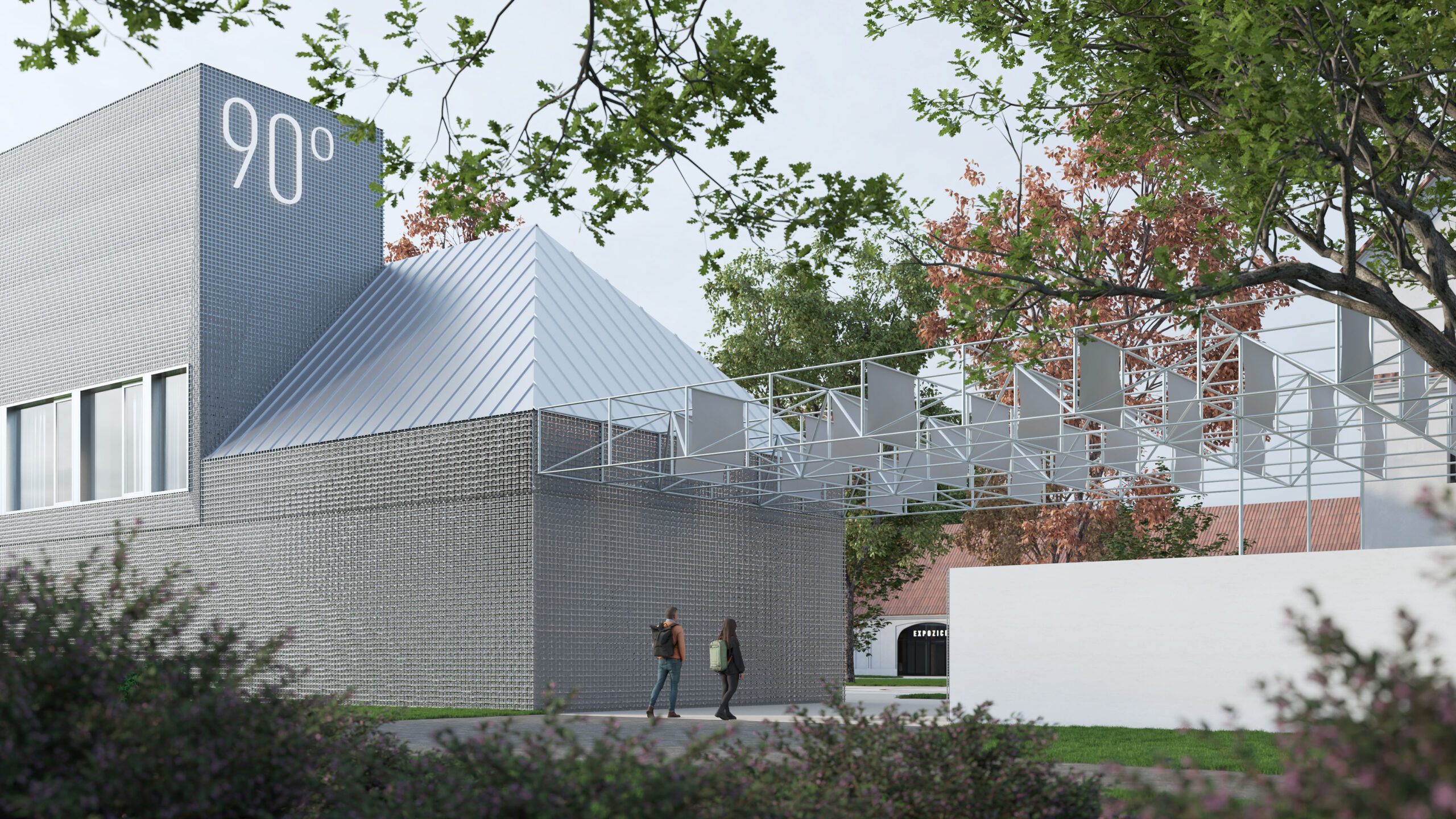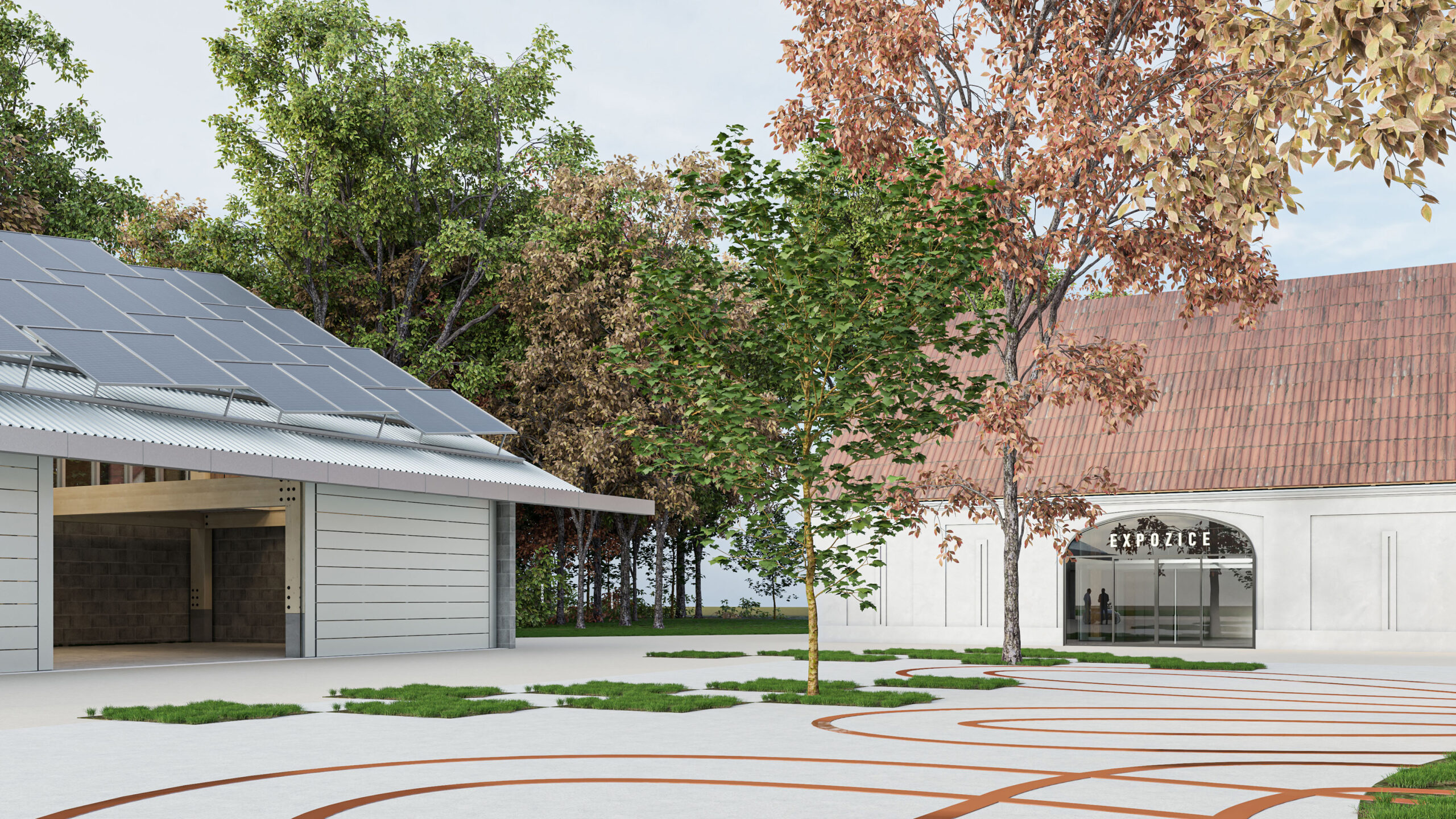 Můj pohled sklouzne k nové budově – Stáj. Na její střeše se tyčí kovový světlík, který se v noci září neonem a ukazuje cestu. Dnes se tu sešlo mnoho hostů: sleduji, jak se dvůr mění v letní kino. Mezi sloupy je napnuté plátno, lidé si přinášejí židle, někteří zůstávají v autech. Všechno utichá, světla pohasínají — a plátno ozáří první záběry filmu.