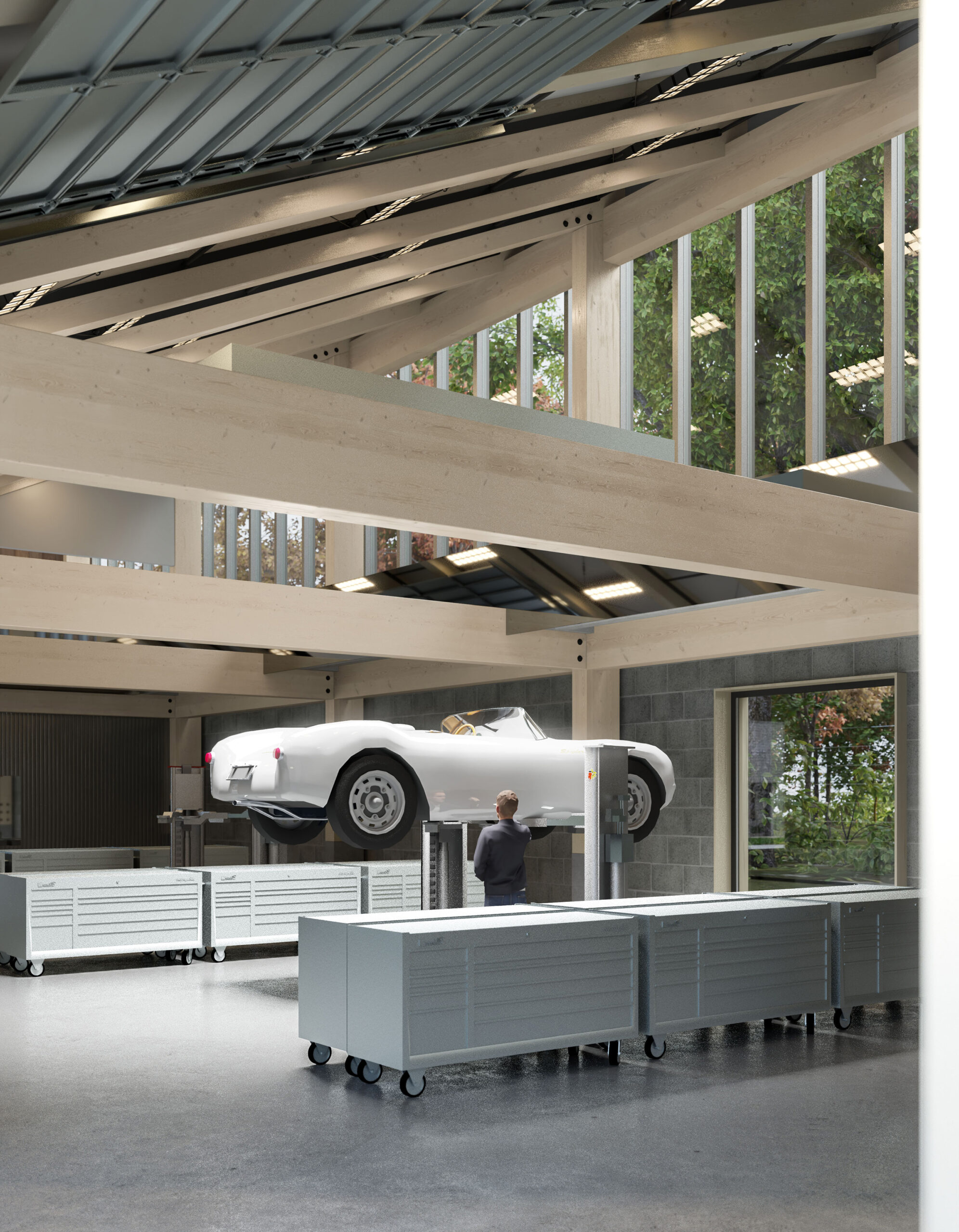 Vyhlédnu z okna: komplex zdejších domů vytváří nádvoří. Stromy na něm vrhají dlouhé stíny a mezi nimi čekají veteráni připraveni na start. Vedle pivovaru stojí nová budova autoservisu. Všechna vrata jsou dokořán, je vidět, jak v hloubce na zvedácích stojí stará auta – mechanici jim dávají poslední doteky. Hned vedle, ve stodole s jasným světlem uvnitř, se schovávají další veteráni: některé jako exponáty, jiné zítra vyrazí na trať.